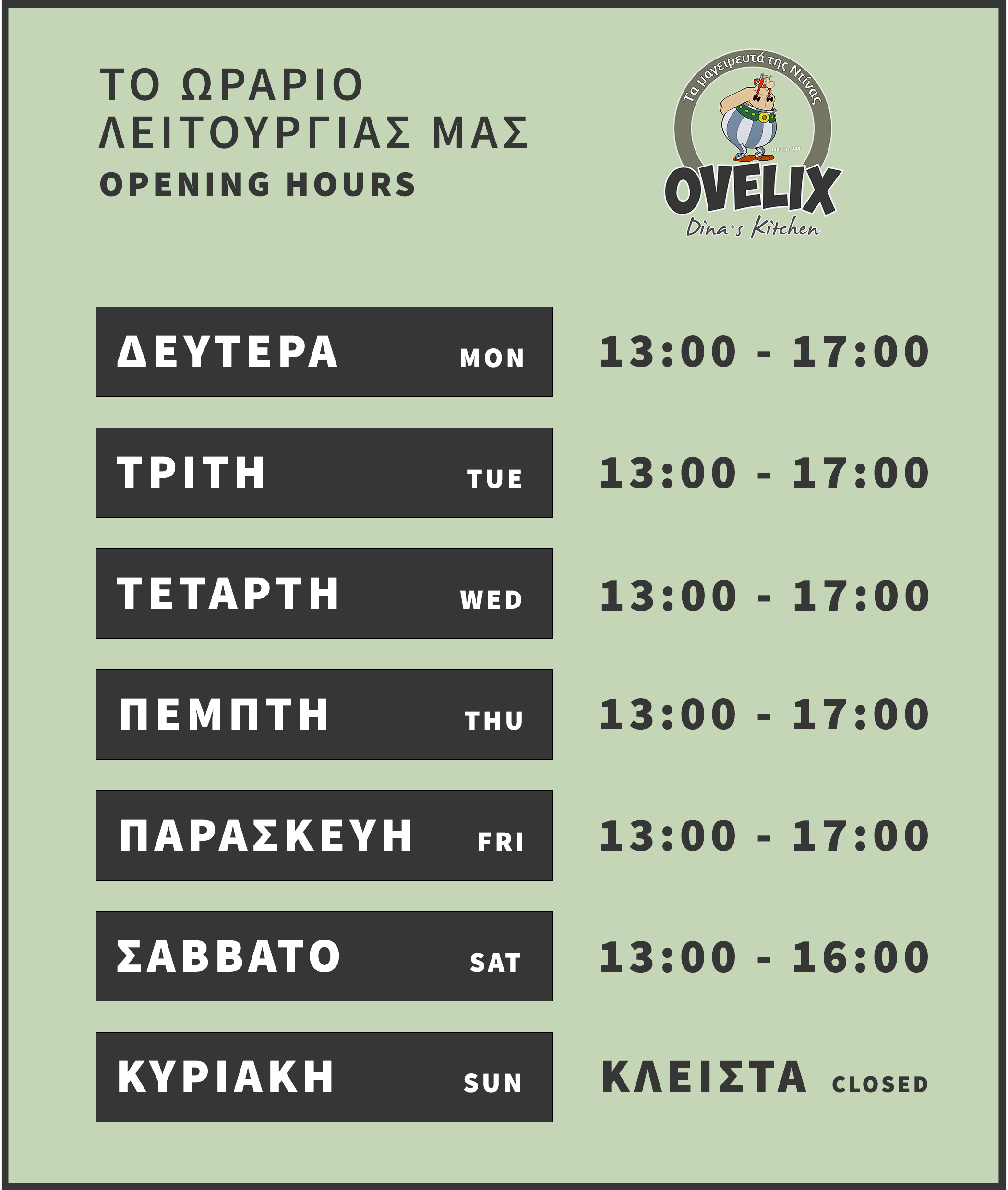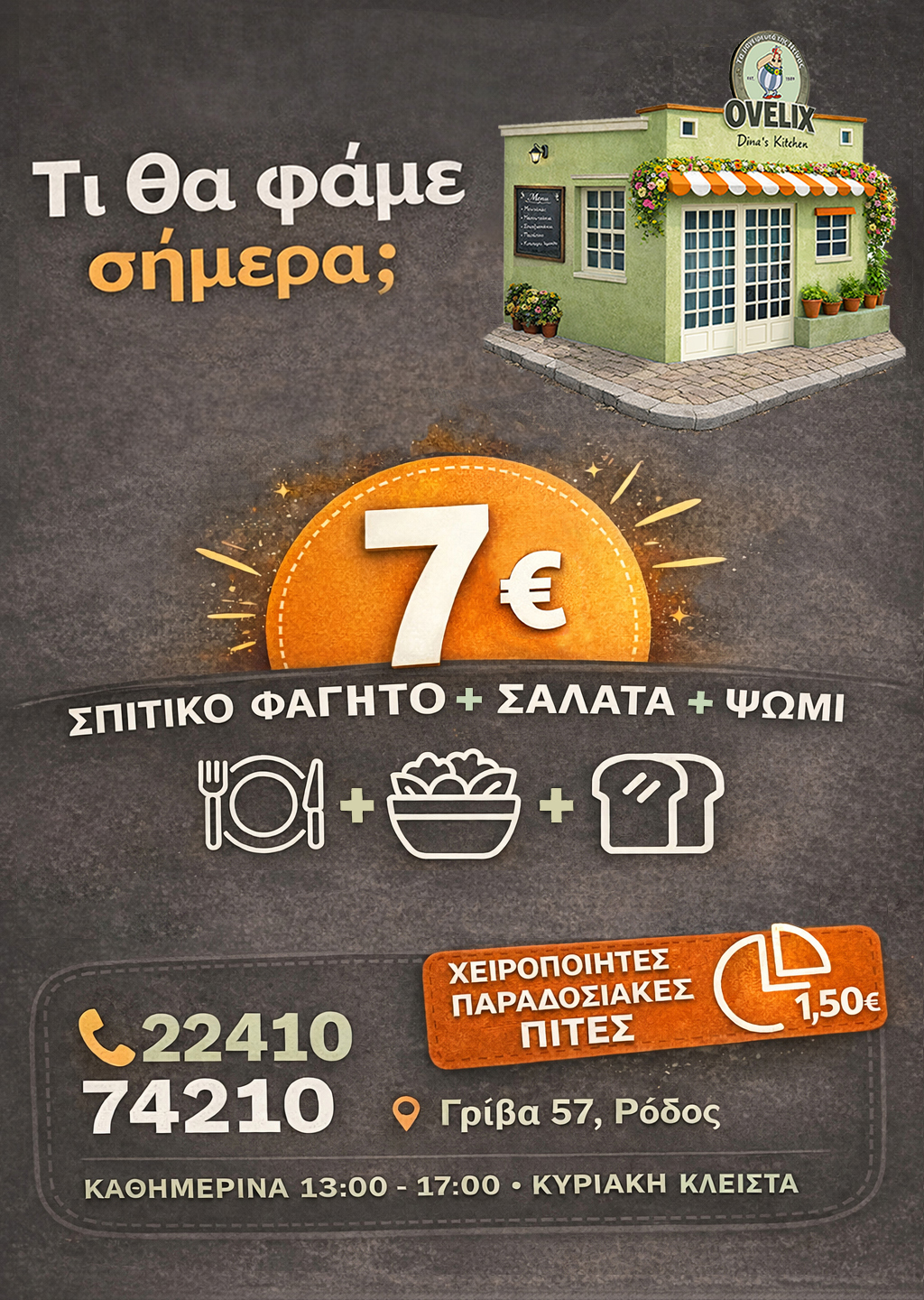 At Ovelix Dina’s Kitchen, we prepare traditional Greek meals daily, just like home cooking.